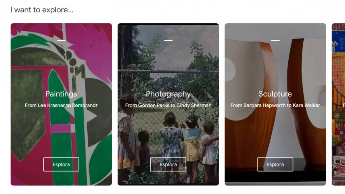 Ci troveremo davanti alla homepage di Google Arte e Cultura che ci propone subito svariate visite guidate suddivise in categorie. Scorrendo la pagina possiamo trovare la categoria "Explore" ed altre, quali visite audioguidate, video o tour virtuali. Questa home riassume parte dei contenuti aggiunti di recente o proposti da Google al momento.
